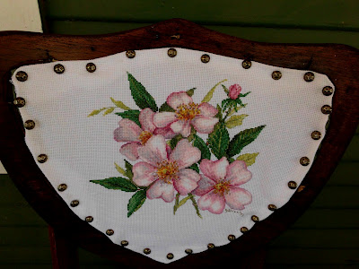 I found a new hobby.............restoring old chairs. I found an old chair discarded at the dump, took it home, refinished it and stitched the back in cross stitch.